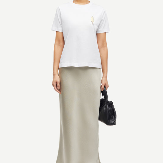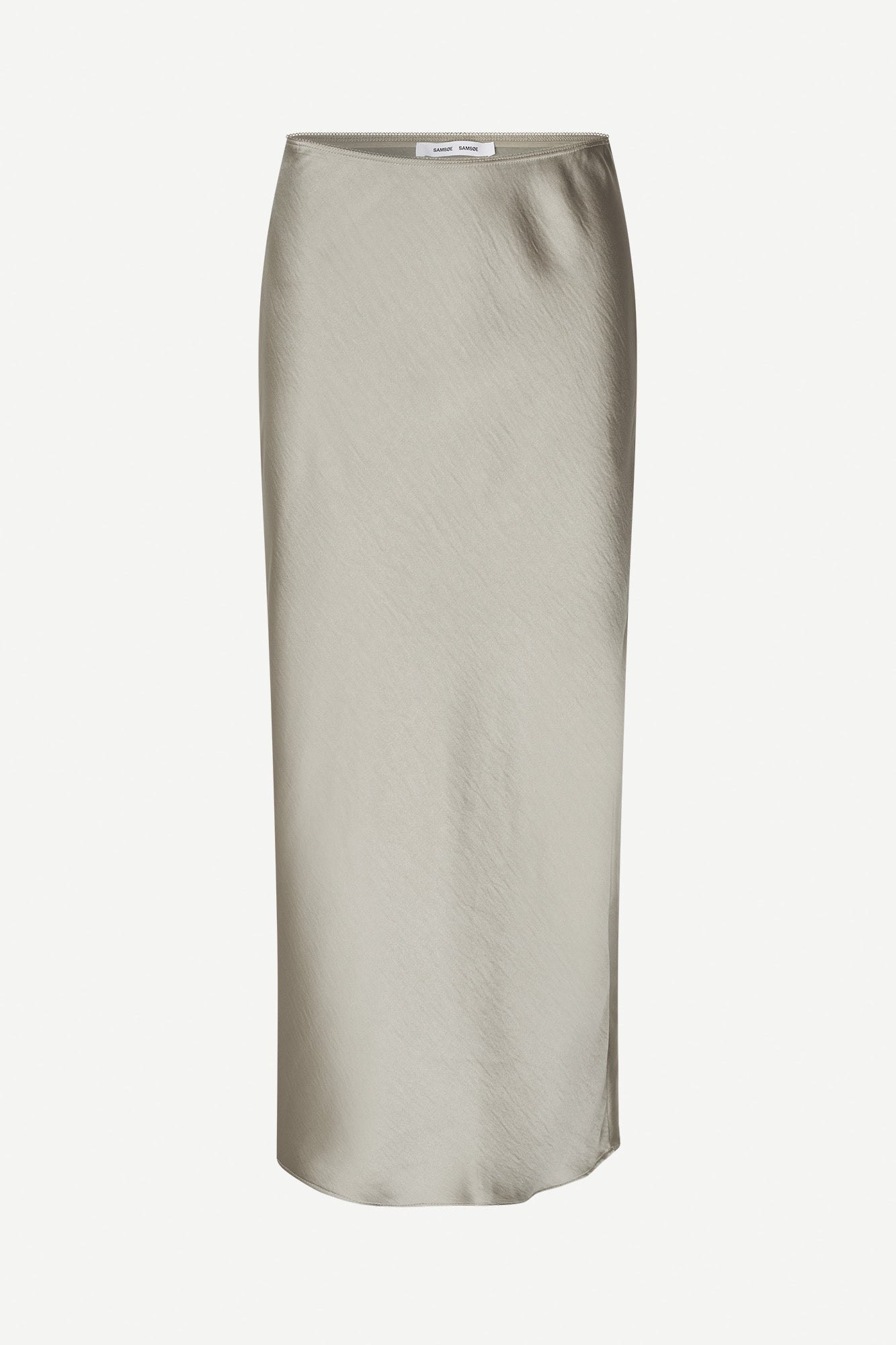 The Saagneta Long Skirt Agate Grey from Scandinavian brand Samsoe Samsoe is a beautifully fluid slip skirt that brings ease and elegance to everyday dressing. Made from recycled polyester in a stunning shimmery grey hue, it catches the light with a subtle sheen and has a luxe, silky feel. Designed to gently skim the hips before falling into a soft mid-length drape, it offers a flattering silhouette that’s as comfortable as it is refined. Style yours with a simple knit and pumps for effortless daywear, or dress it up with a camisole and heels for a chic, understated evening look.