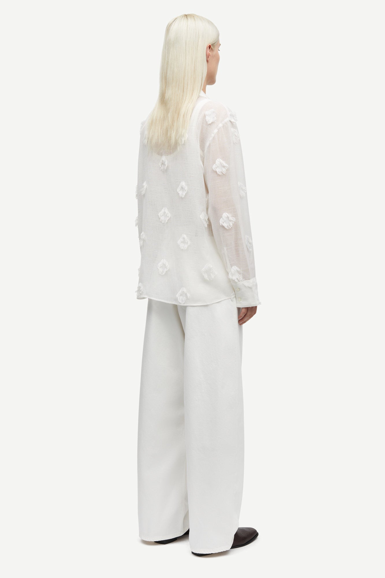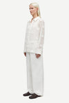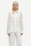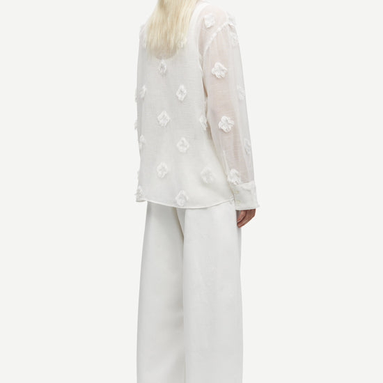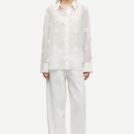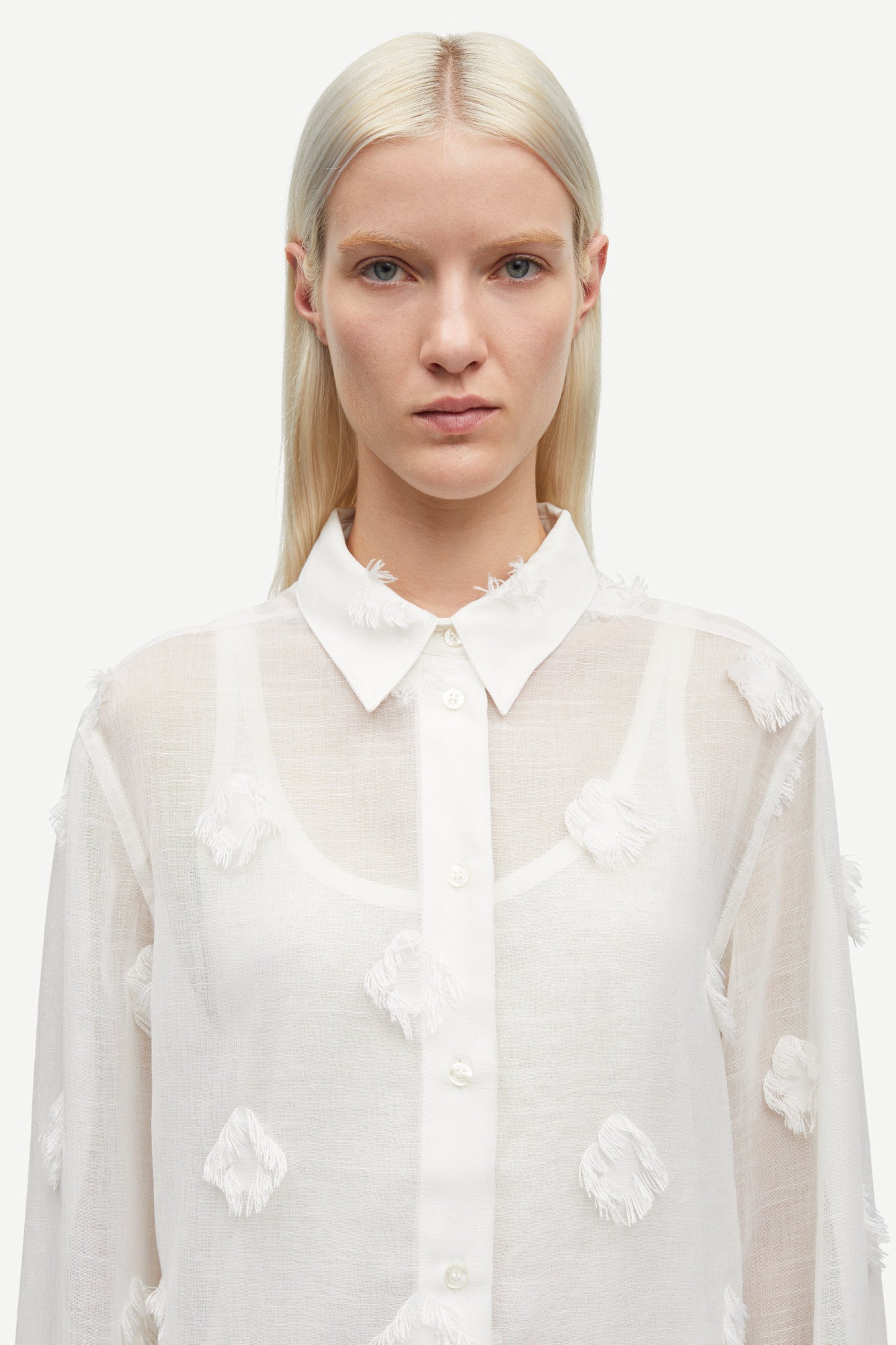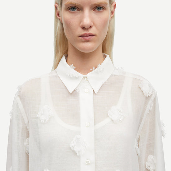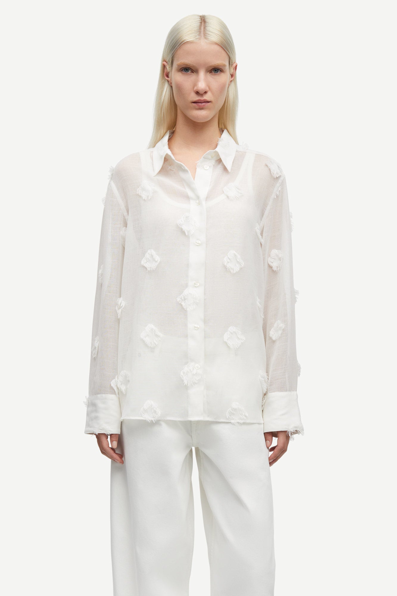 The Sanot Shirt Egret from Samsoe Samsoe is a beautifully lightweight, textured layer that brings a soft, modern elegance to everyday dressing. Cut with a loose fit and dropped shoulders for an effortless drape, it features a classic button placket, buttoned cuffs, and subtle all-over texture for added depth. Made from a semi-sheer fabric blend with recycled polyester, it feels airy and refined - perfect for transitional styling. Wear yours with the matching Saagnete Skirt for a tonal co-ord look that balances ease and sophistication, or tuck into high-waisted denim for a more relaxed, pared-back approach.