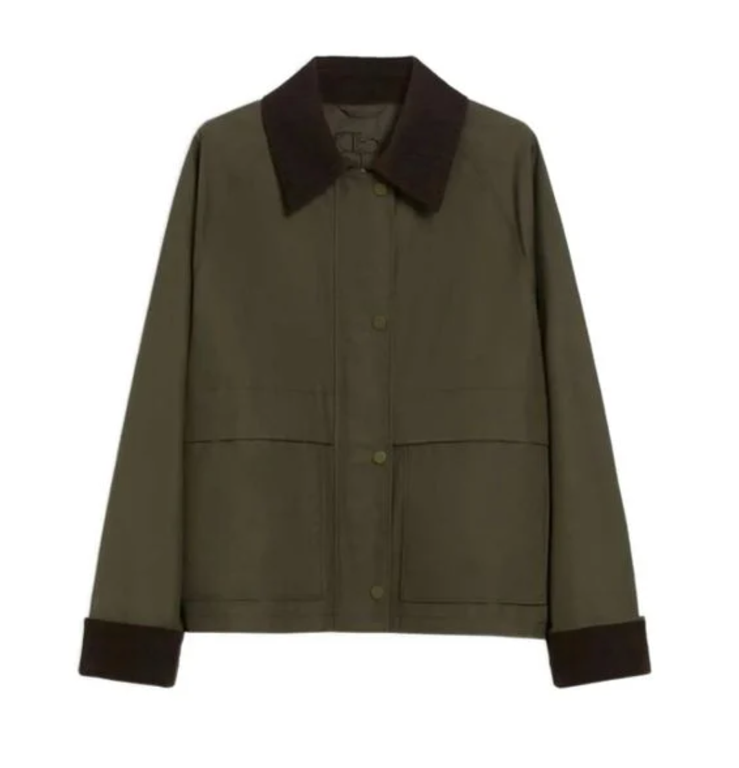 A fresh take on utility style, the Sarzana Short Coat in khaki green is equal parts practical and polished. Its sleek, structured silhouette is accented by a rich brown corduroy collar and matching turn-back cuffs, lending the piece a refined, heritage-inspired edge.