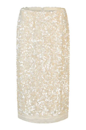 Turn heads with the Shiny Skirt from Second Female - a refined yet dazzling statement piece designed to elevate your wardrobe. This eye-catching pencil skirt is adorned with shimmering, multi-sized sequins set against a tonal background, creating a dynamic, light-catching texture that moves beautifully with you.