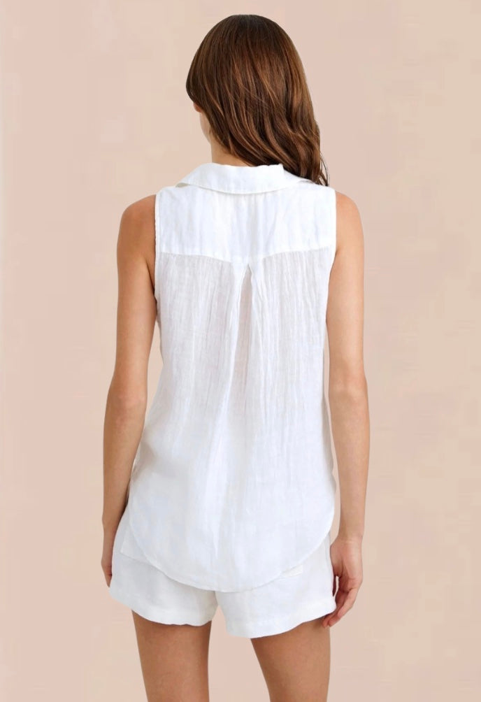 Sleeveless Pullover Top in crisp white linen, designed for effortless summer style. This lightweight bella dahl piece features a flattering V-neck, classic collar, and shaped hem with rear pleat for refined movement. Crafted from 100% linen, it's breathable and perfect for warm-weather dressing, holiday getaways, and casual everyday wear. The relaxed silhouette pairs easily with shorts, linen trousers, or layered skirts for versatile styling options.