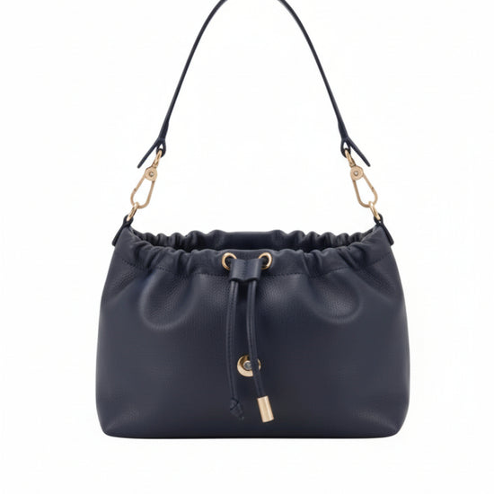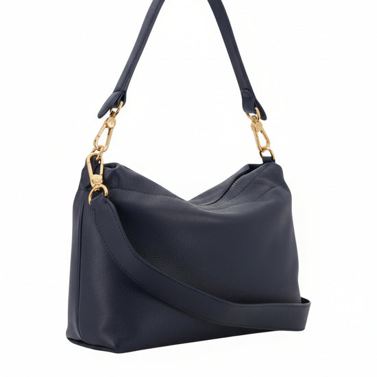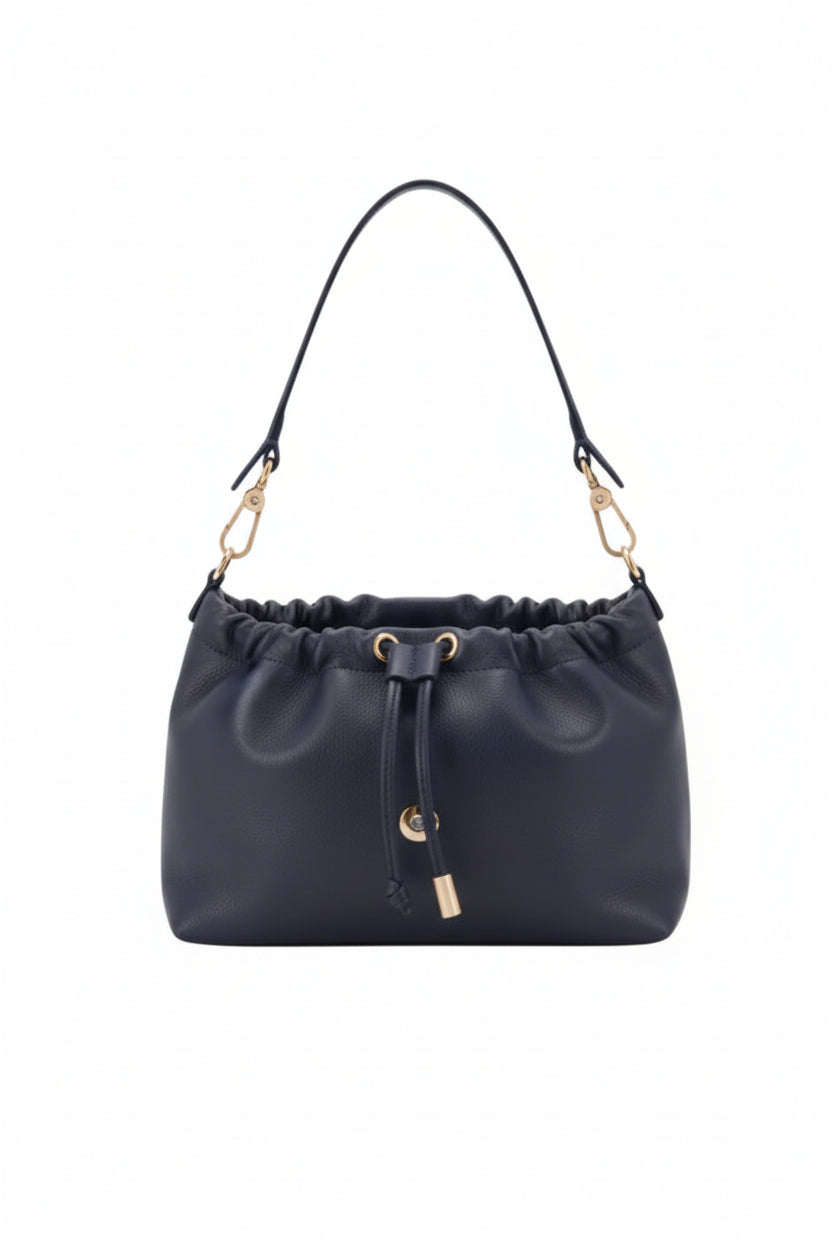 The Temi Bag in Navy by Abro is a chic and functional everyday accessory made from premium Italian cow leather. Its sleek design is elevated by elegant gold hardware and a structured top handle, offering a timeless look that pairs effortlessly with any outfit.