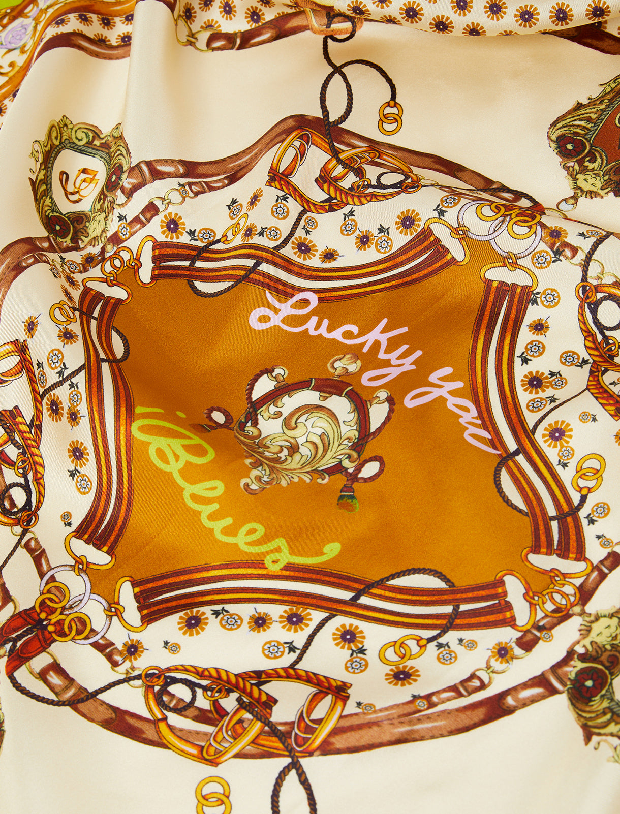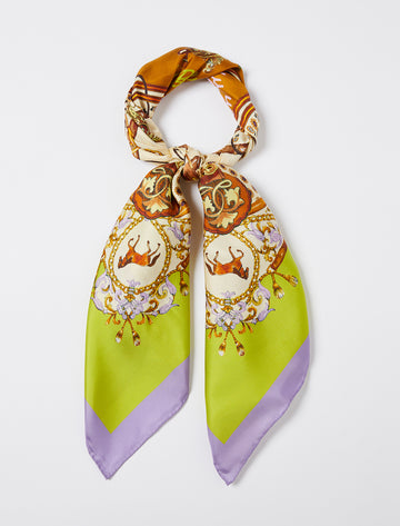 Elevate your accessories game with the Tropea Silk Scarf in the striking Green Horses print from iBlues. Crafted from luxuriously soft silk, this vibrant square scarf showcases an eye-catching mix of equestrian-inspired motifs - including galloping horses, reins, and riding gear - set against a bold backdrop of bright green and rich purple tones.