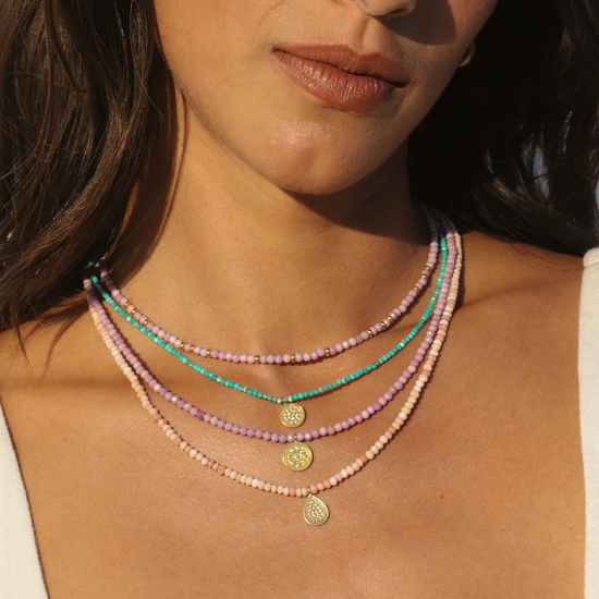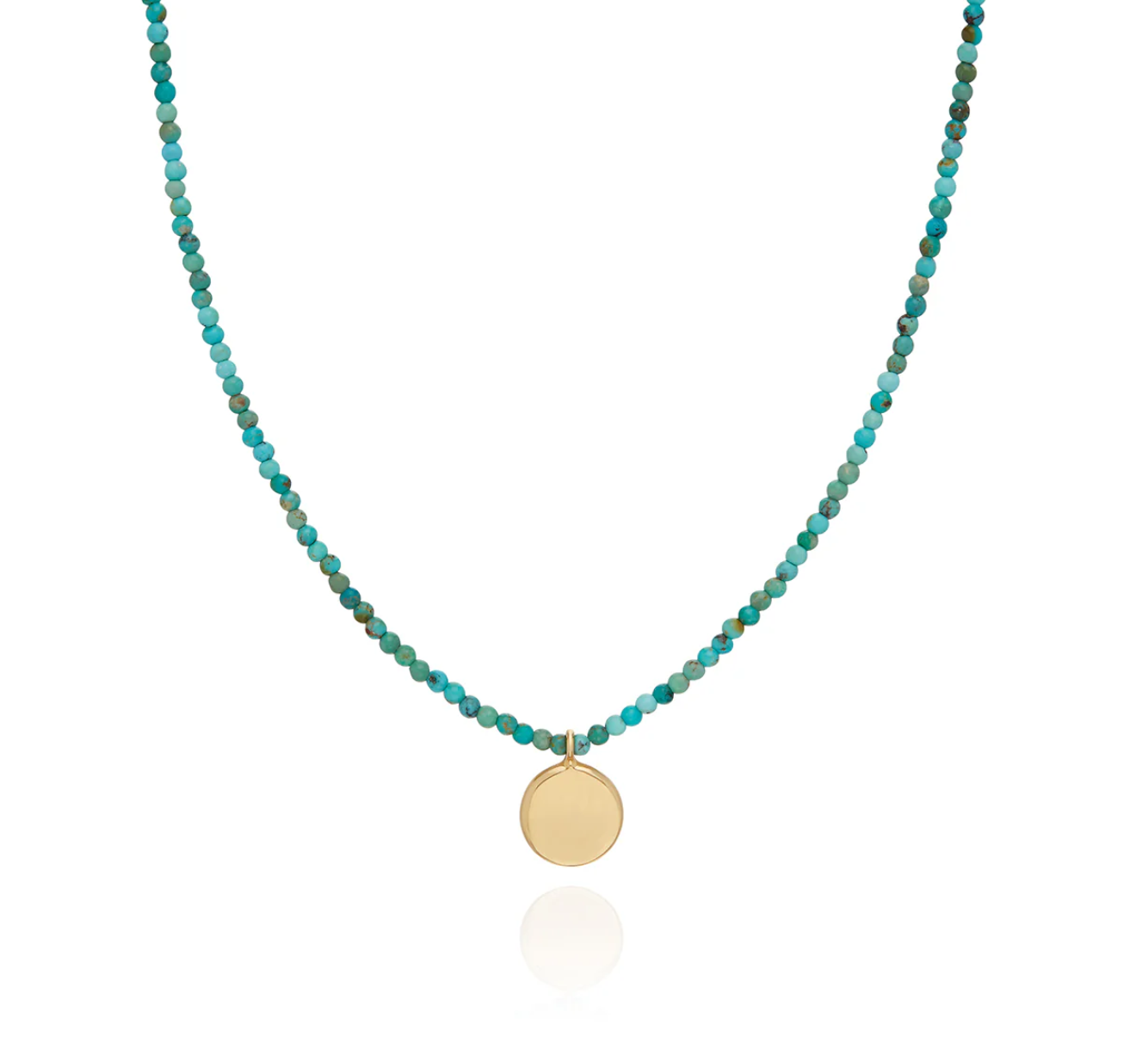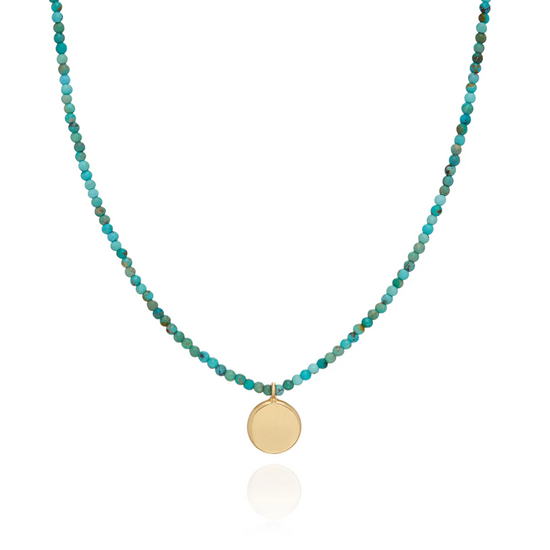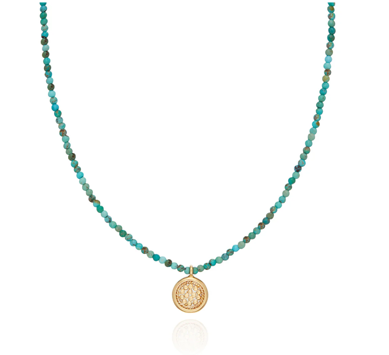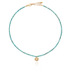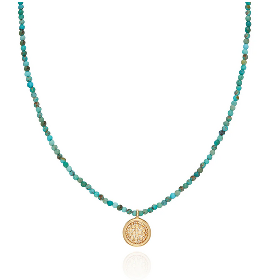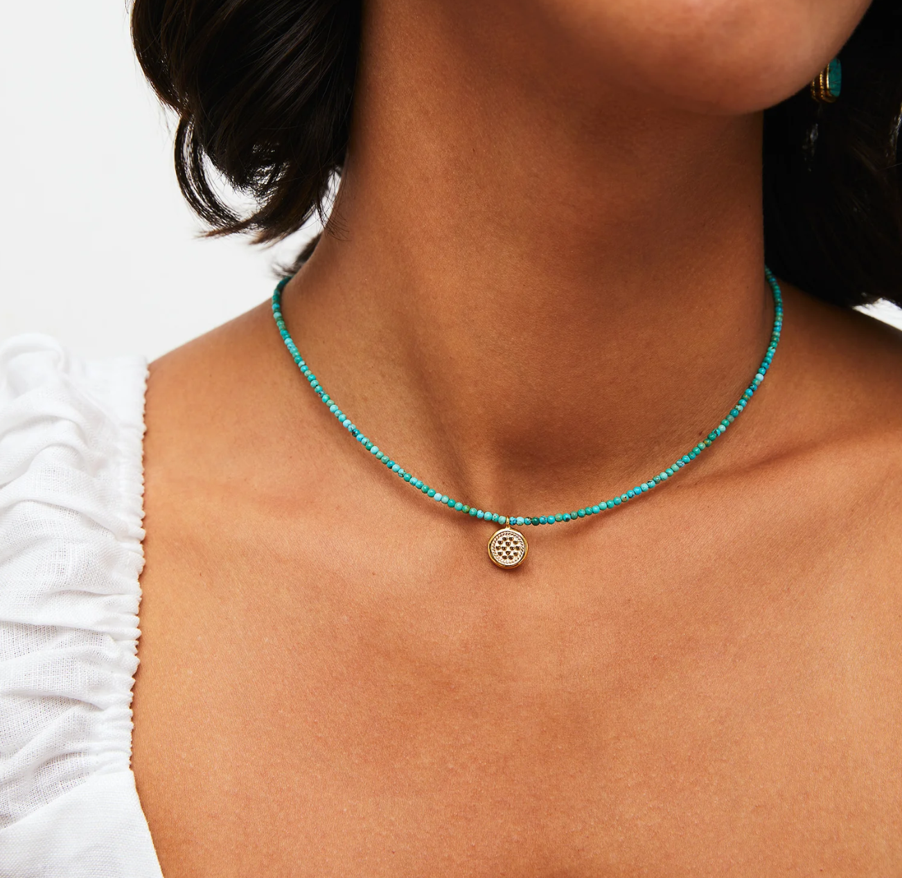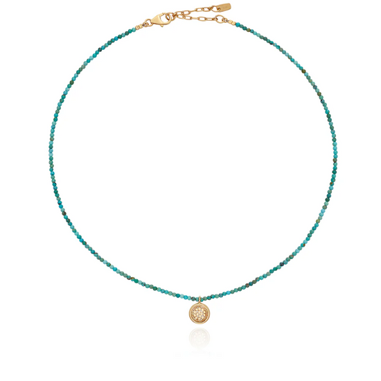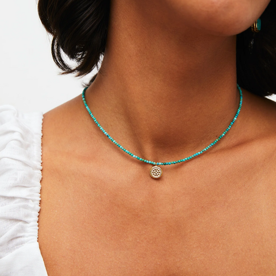 Delicate, meaningful, and rich with craftsmanship, the Turquoise Beaded Necklace by Anna Beck is a beautiful blend of colour and heritage. Tiny turquoise beads - each one unique - form the base of this graceful design, centered by our signature round pendant, adorned with handcrafted Balinese dotting work in radiant 18k gold plating.