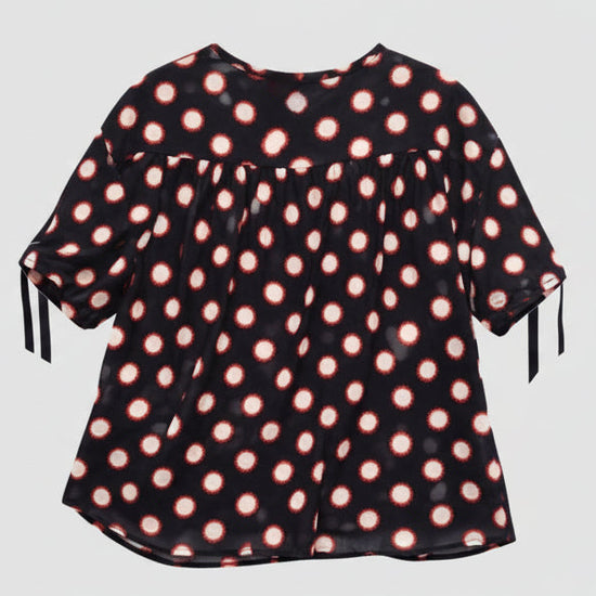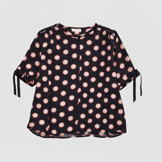 Short sleeves are finished with adjustable drawstring black tabs, adding subtle shape and modern edge, while glossy black buttons run down the front for a sleek, elevated touch. Set against a black background, the all-over print of cream circles accented with small red dots brings a striking yet sophisticated contrast.
