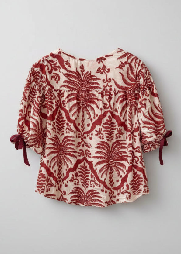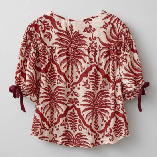 Short sleeves are finished with adjustable drawstring tabs, adding subtle shape and a modern edge, while glossy black buttons run down the front for a sleek, elevated touch. Set against an ecru background, the all-over ruby red palm leaf print adds a bold yet sophisticated pop of colour.