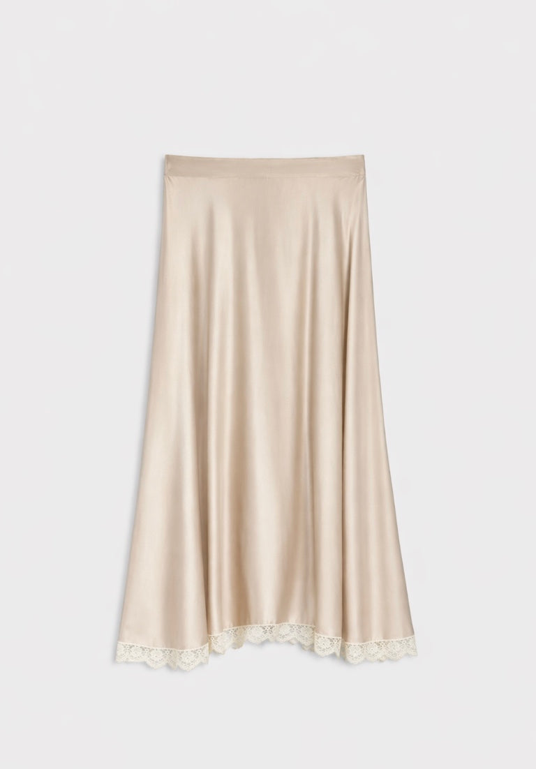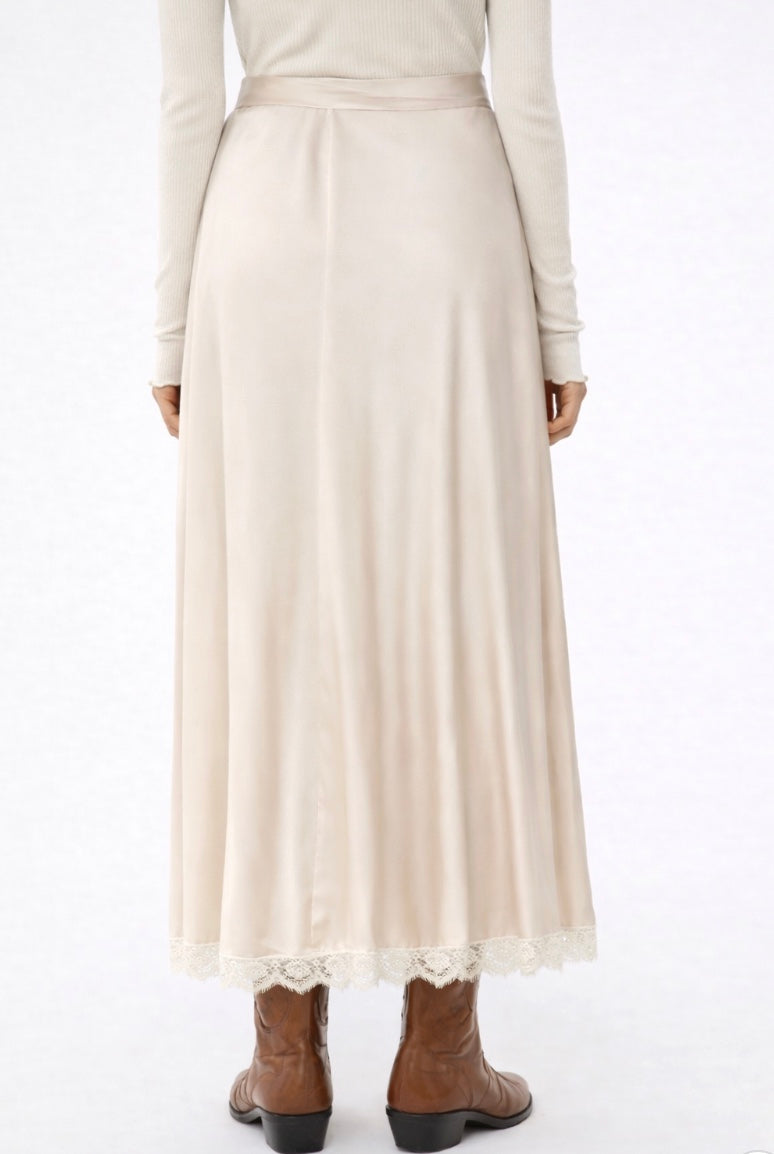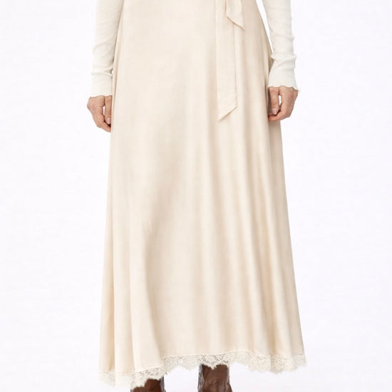 Elegant Vertice Skirt Ivory by IBlues featuring a delicate lace-trimmed hem and a beautiful waist tie for a flattering fit. The flowing silhouette creates graceful movement with every step, perfect for both casual and occasion wear. Crafted for versatility, this timeless piece transitions effortlessly from day to evening. The soft fabric drapes beautifully while the intricate lace detailing adds feminine sophistication. An essential wardrobe staple that pairs with virtually anything in your collection.