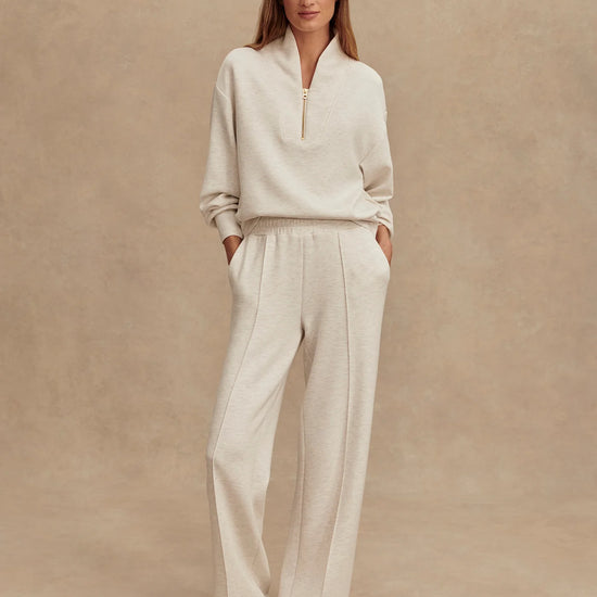 Lounge in style in the Wide Leg Pant 30 Ivory Marl from Varley. Cut in the super soft Double Soft fabric in a flattering wide leg style. With the comfortable high rise, elasticated waist with drawstrings and the elegant tuck detailing, these trousers are stylish and comfy and perfect for those dressed down days when you don't want to compromise on style!