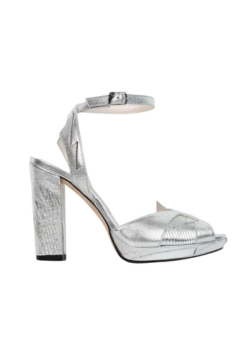 The Zia Mid Silver sandals from Terry de Havilland will make you the ultimate trend setter! The open toe platform, metallic leather, and mock-snake-lightening-shapes will ensure you sparkle and shine. Strut your stuff with the thin ankle strap, silver metallic buckle, and cushioned leather sole. Style with black silk trousers and a cami for an undeniably fabulous look.