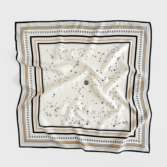 Mystical, elegant, and timelessly chic - the Zodiac Scarf 65cm White, Sand & Black by lescarf is a striking statement piece designed to elevate everyday styling. Crafted from luxurious silk and cut in a 65cm square, this beautifully detailed scarf features a white background accented with beige and black detailing, creating a refined yet eye-catching aesthetic. At the centre, a celestial zodiac motif captures the imagination with its intricate design.