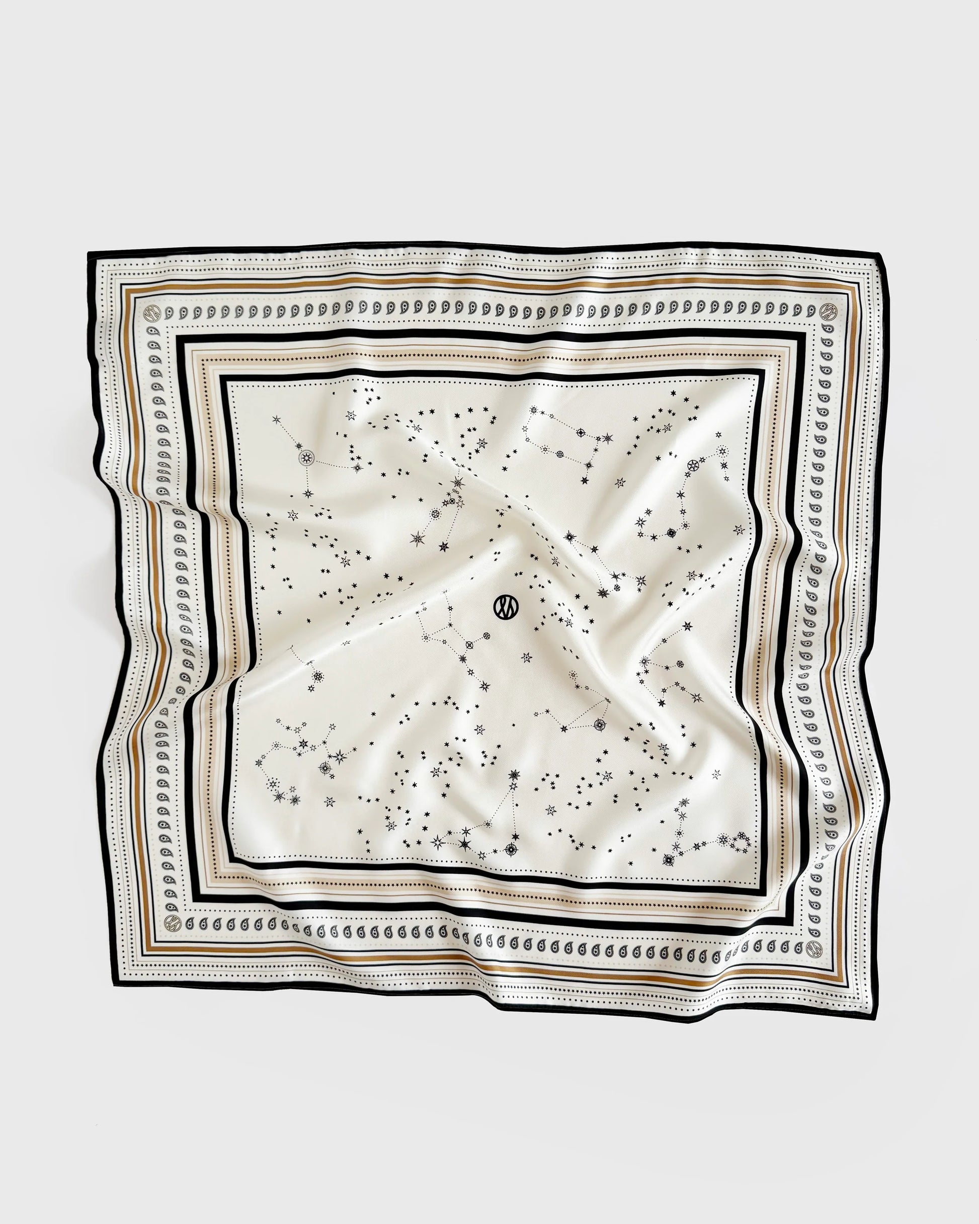 Drape it over the shoulders, tie it at the neck for a polished accent, or wear it as a chic headscarf or top. Whether styled with crisp tailoring, a minimal blouse, or layered over a knit, the Zodiac Scarf in White, Sand & Black brings effortless elegance and personality to any outfit.